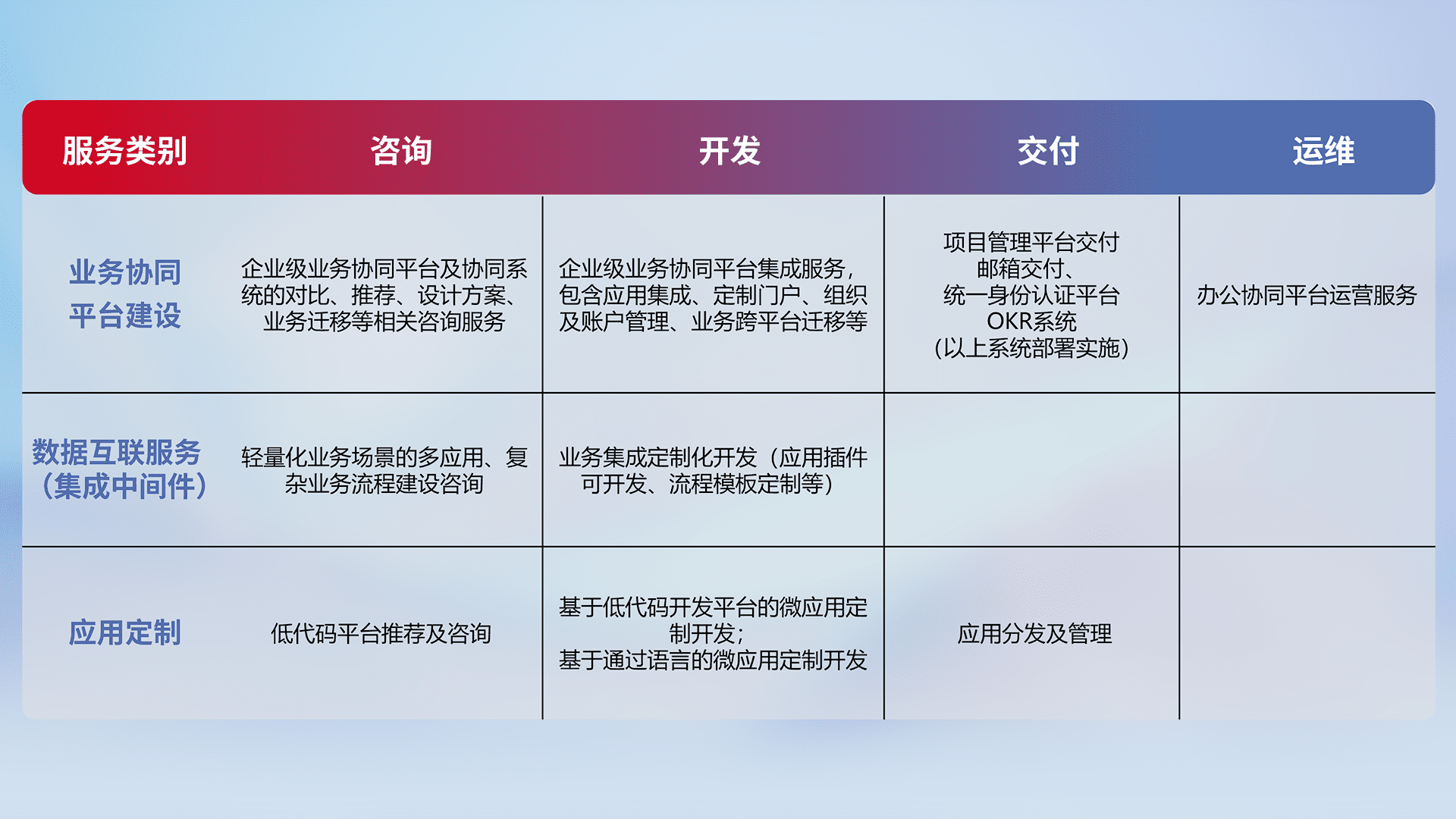 针对钉钉、、企微、、IDaas等平台级产品提供产品的规划、、、方案、、交付、、定制化开发等服务,,实现如统一协同办公、、智能客户服务、、、、混合会议管理、、智能数据查询、、、、等业务场景,,,实现数字化转型。。