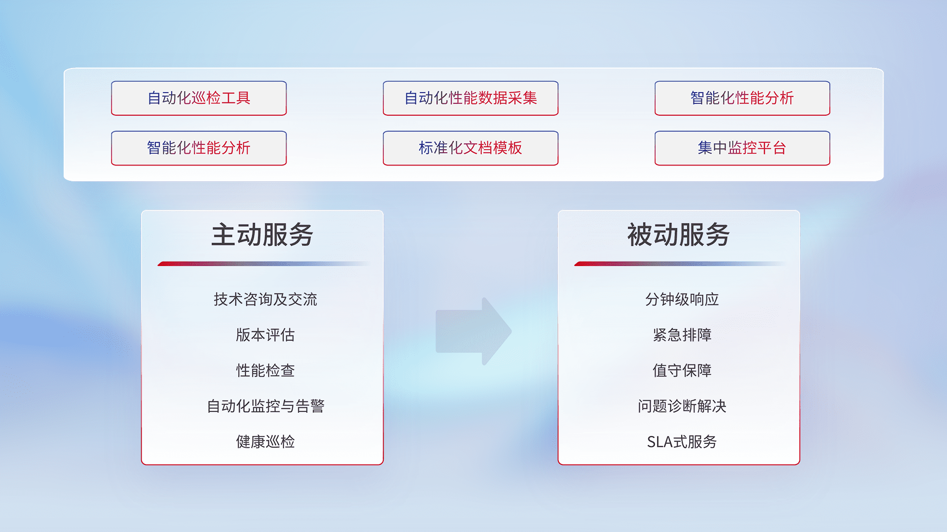 智能化工具和标准化文档,,,,保障服务质量,,提供主动服务(包含技术咨询、、、、版本评估、、、性能检查、、、、自动化监控与告警、、、、健康巡检)和被动服务包含(分钟级响应、、、、紧急排障、、、、值守保障、、、问题诊断解决、、、、SLA服务)。。。
